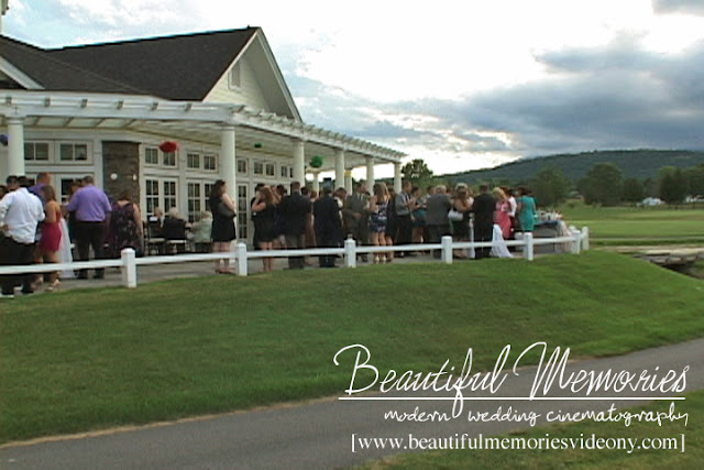 After the ceremony, they were off to celebrate at The Lazy Swan Golf and Country Club Village in Saugherties. This was our first visit to The Lazy Swan and we hope to film there more often. It's a stunning venue with beautiful grounds, perfect for taking wedding photos and for your guests to enjoy as they mingle during cocktail hour. The ballroom is octagonal with a gorgeous octagonal wooden dance floor and an elaborate in-house lighting system that was customized to fit Andera and Nick's colorful theme. The staff was wonderful to work with and the food was phenomenal. It was the perfect setting for this colorful, glamorous, high-energy celebration.